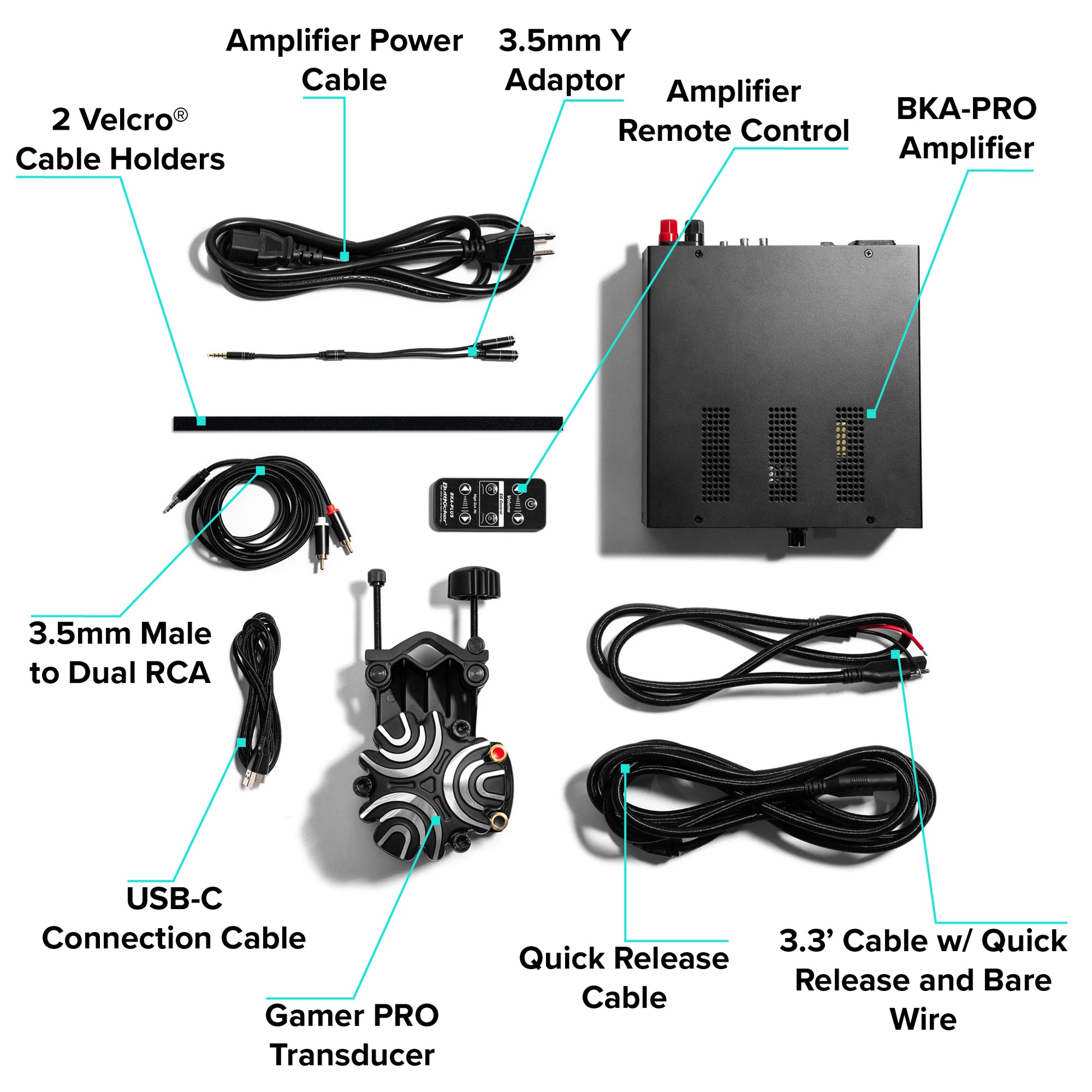 - Approx. 3.3 ft (1 m) cable with quick release and bare wire connecting to Gamer PRO transducer