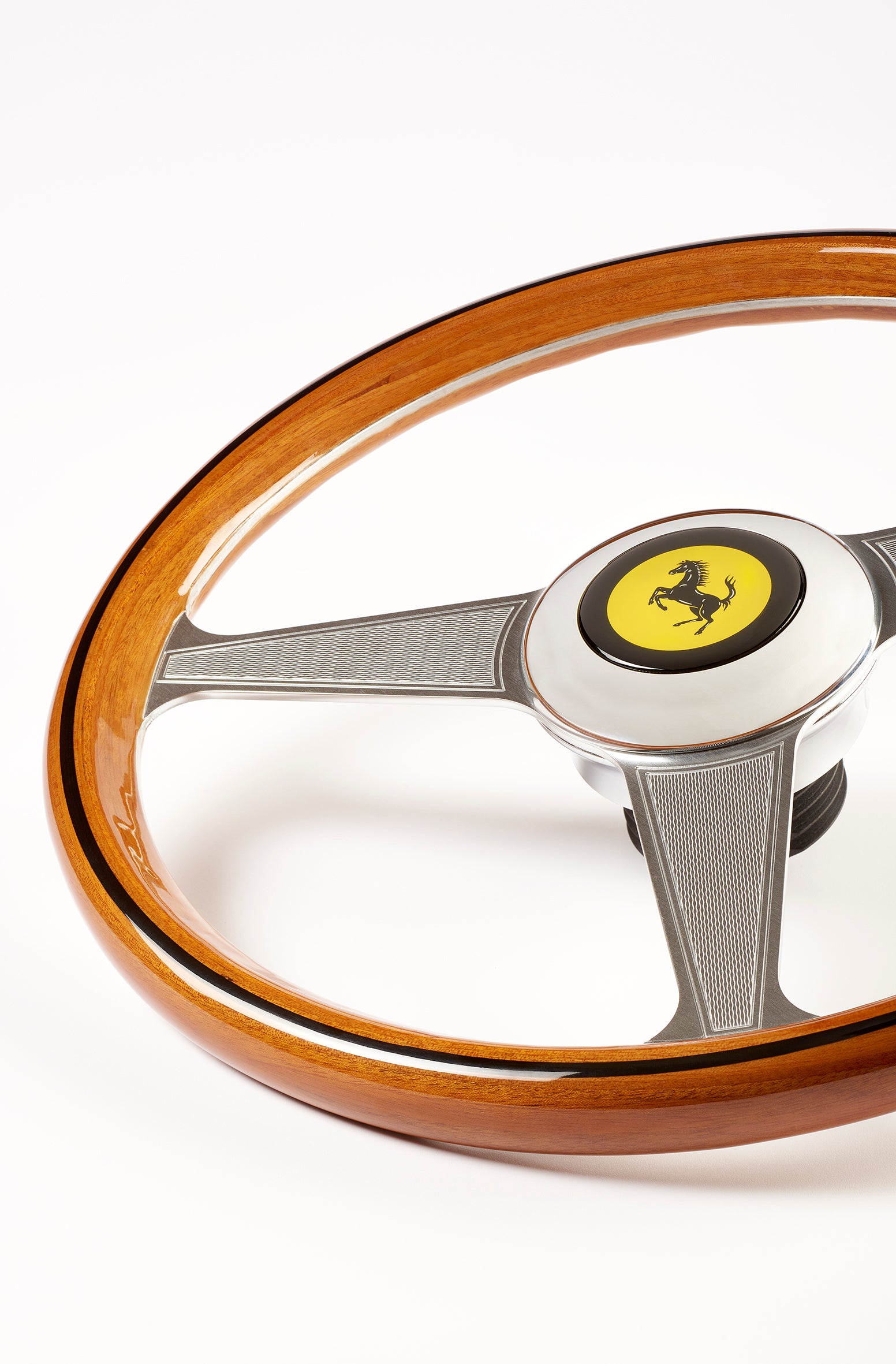 The Ferrari 250 GTO Wheel Add-On boasts a metal faceplate and internal structure, an authentic chrome logo plate in the center, plus genuine high-quality wood covering the wheel’s entire circumference with a black ring running through the middle: the resulting design is understated and sleek. All of these carefully-reproduced details transport the user right back to the 1960s. One only needs to test out the Ferrari 250 GTO in the game Assetto Corsa (available as part of the Ferrari 70th Anniversary DLC Pack), for example, to find oneself fully immersed in real vintage car racing sensations, with their inimitable panache.